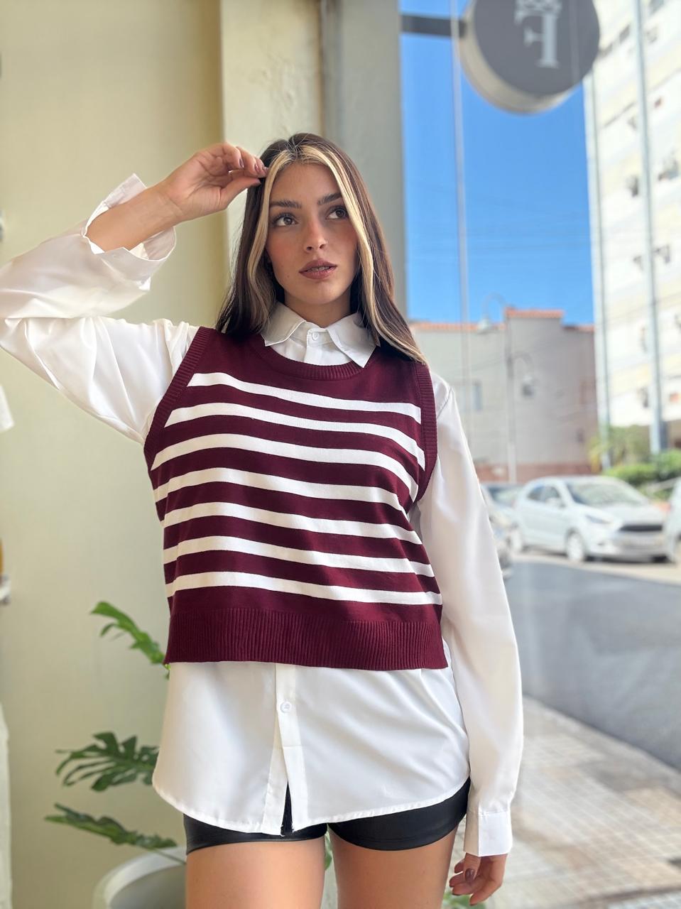 Chaleco de punto sin mangas en diseño a rayas horizontales en color bordo y blanco. Presenta escote redondo y terminaciones acanaladas en cuello, sisas y bajo. Ideal para superponer sobre camisas, como en la imagen, logrando un look preppy y moderno para el otoño-invierno.