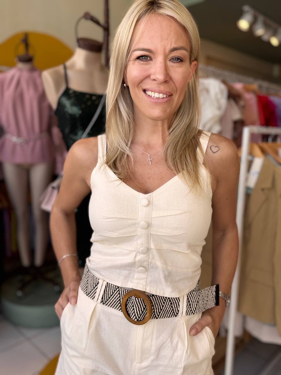 Refrescante, liviano y con mucho estilo. Éste conjunto de lino combina una camisa de corte relajado con botones frontales y un short de contura alta con elástico,ideal para los días de calor.